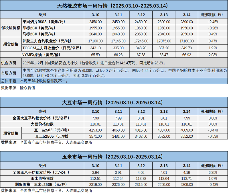 天然橡膠、大豆、玉米市場一周行情(2025.03.10-03.14)