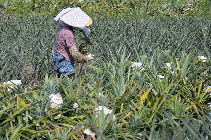 在神灣大果園農(nóng)場(chǎng),果農(nóng)正在采摘菠蘿。 (攝影|繆曉劍)