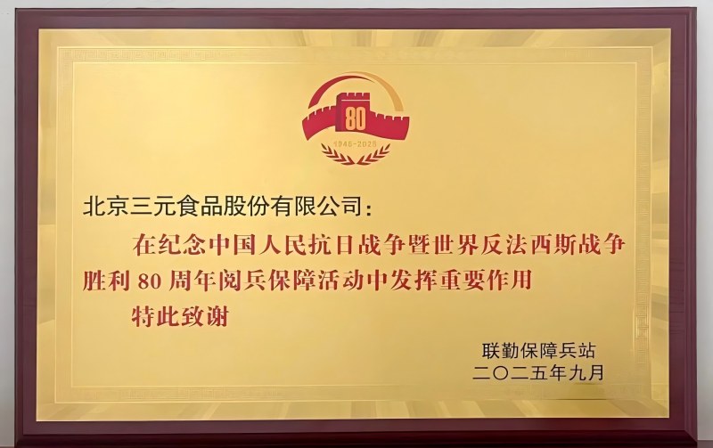 2025年9月3日,中國人民抗日戰(zhàn)爭暨世界反法西斯戰(zhàn)爭勝利80周年紀念活動隆重舉行。在這場國家盛事的背后,三元食品以高度的責(zé)任感和使命感,全力肩負起訓(xùn)練基地乳制品及閱兵餐包酸奶的供應(yīng)保障任務(wù),以卓越的產(chǎn)品和可靠的服務(wù),全面踐行著國有企業(yè)的責(zé)任與擔(dān)當(dāng)。