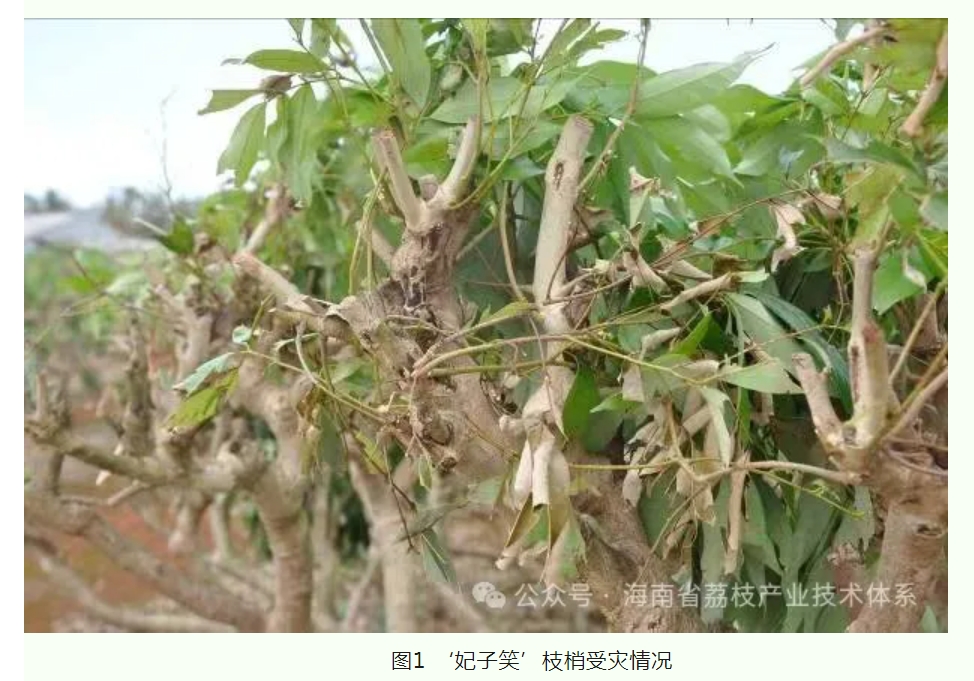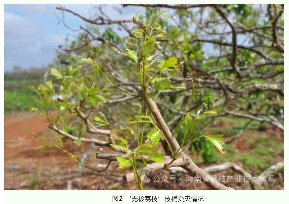 荔枝枝梢生長(zhǎng)期正值海南的雨季,臺(tái)風(fēng)活動(dòng)頻繁。荔枝營(yíng)養(yǎng)生長(zhǎng)期遭遇強(qiáng)風(fēng)暴雨易造成葉片破損、樹枝折斷,甚至整株倒伏,對(duì)荔枝來年的產(chǎn)量形成造成嚴(yán)重影響,為有效應(yīng)對(duì)臺(tái)風(fēng)災(zāi)害對(duì)荔枝生產(chǎn)造成的不利影響,提出如下建議: