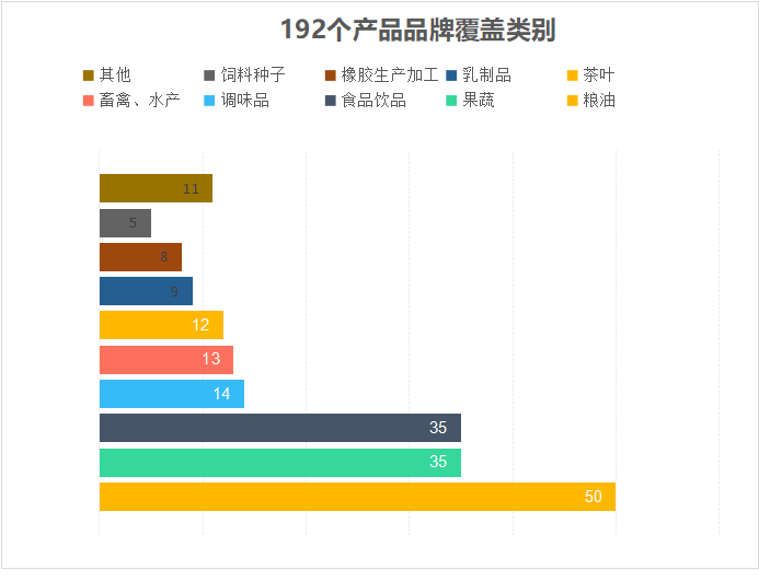 《中國農(nóng)墾品牌目錄》中,僅192個產(chǎn)品品牌其涵蓋范圍就包括糧油、果蔬、食品飲料、茶葉、乳業(yè)等多個領(lǐng)域,其中糧油類50個、果蔬類35個、食品飲料35個,占所有收錄類別63%。與《中國農(nóng)業(yè)品牌目錄2019農(nóng)產(chǎn)品區(qū)域公用品牌》300個、11個門類相比,農(nóng)墾品牌全品類特征明顯。