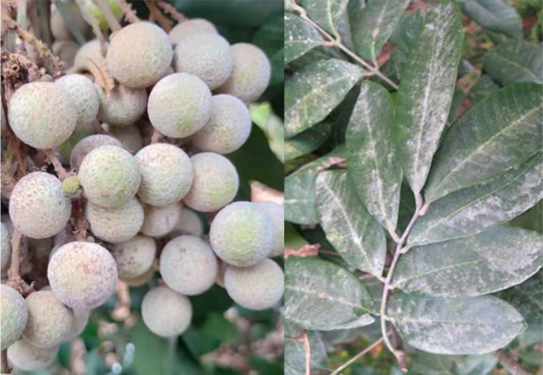 廣東與廣西是我國龍眼的重要主產(chǎn)區(qū),現(xiàn)正陸續(xù)進(jìn)入采收旺季。今年夏季持續(xù)高溫高濕,導(dǎo)致部分果園龍眼白霉病發(fā)生嚴(yán)重。該病主要為害接近成熟的龍眼果實及葉片,往往先發(fā)生在樹冠中下層枝葉稠密的果穗或葉片上。在果實上,病菌菌絲和孢子形成的一層白色霉?fàn)钗锟筛采w整個果實表面,導(dǎo)致部分果枝干枯和果實脫落或果皮暗褐色、果肉變質(zhì)腐爛;中度和輕度發(fā)病的果實,雖果肉未腐爛,但品質(zhì)與風(fēng)味下降。受害葉片則正面覆蓋有一層白色霉?fàn)钗?,雖不形成壞死病斑,但引致葉片早衰。