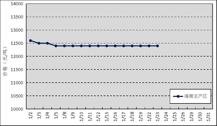 國(guó)內(nèi)主產(chǎn)區(qū):1月中下旬,海南產(chǎn)區(qū)全面停割,至此國(guó)內(nèi)膠園全部進(jìn)入停割期。海南原料膠(折干膠)月均價(jià)格為12425元/噸,環(huán)比上漲158元/噸。