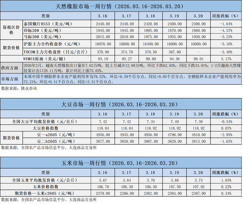 天然橡膠、大豆、玉米市場(chǎng)一周行情(2026.03.16-03.20)