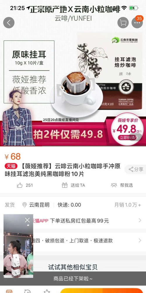 2020年4月25日,云南農(nóng)墾咖啡有限公司攜手淘寶好物推薦官薇婭女士,開展了“云啡”咖啡產(chǎn)品2020年度第一次直播。此次直播約2000多萬人觀看,張嘉倪、岳云鵬、宋小寶、賈乃亮、王迅及鄧倫等影視明星嘉賓助力直播,為云南農(nóng)墾咖啡有限公司掛耳咖啡做產(chǎn)品介紹及推廣,5秒實現(xiàn)3噸咖啡的驚人銷量,刷新了2019年單次直播3秒銷售1.3噸的佳績。