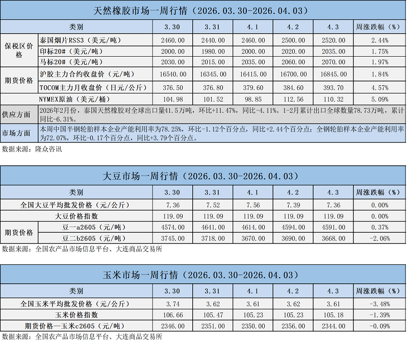 天然橡膠、大豆、玉米市場一周行情(2026.03.30-04.03)