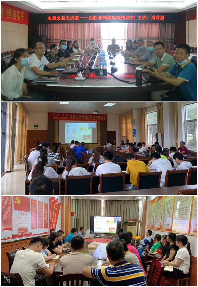在兩個小時的課程中,肖有恩講解了非洲豬瘟病毒的生物學(xué)特性,提出“非洲豬瘟可防可控,不可治,可復(fù)產(chǎn)”的論斷,突出了疫病防控的極端重要性。細節(jié)決定成敗,肖有恩結(jié)合桂墾牧業(yè)公司的生產(chǎn)和防控實踐,詳細介紹了非洲豬瘟的檢測技術(shù),分享了建立健全生物安全體系,通過全方位、無死角的檢查監(jiān)督,嚴格落實人、豬、車、料、水、蟲等管理措施,切斷疫病傳播的經(jīng)驗。他還就出現(xiàn)疫情后如何采取應(yīng)急措施進行凈化、消殺,再恢復(fù)生產(chǎn),提出了一整套成熟的技術(shù)方案。