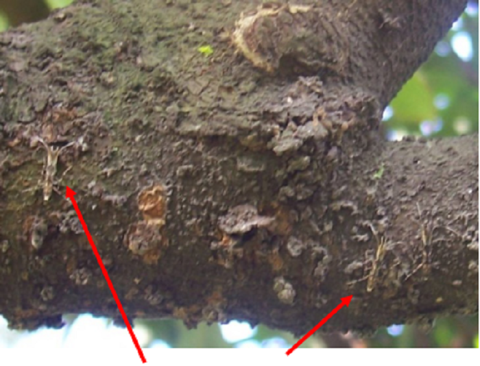 三、檢查藥效,及時(shí)進(jìn)行補(bǔ)藥噴殺。根據(jù)成蟲白天棲于陰涼的樹(shù)冠內(nèi)膛枝桿上(如下右圖),受到驚嚇時(shí)會(huì)飛離枝桿這一特性,可每天清晨到果園進(jìn)行實(shí)地調(diào)查,對(duì)荔枝內(nèi)膛的枝桿進(jìn)行拍打(如下左圖),如發(fā)現(xiàn)還有成蟲飛出,2天后再次噴藥。