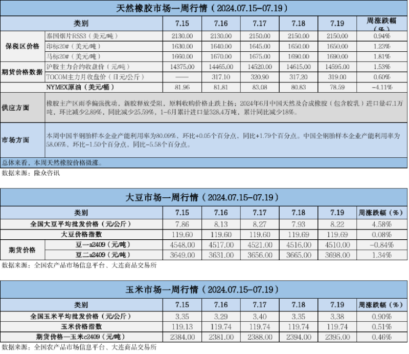 天然橡膠、大豆、玉米市場(chǎng)一周行情(2024.07.15-07.19)