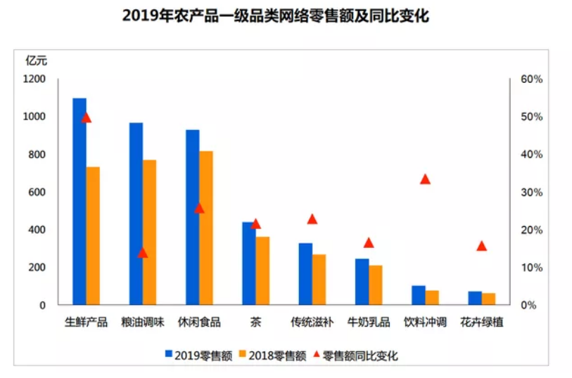 《報(bào)告》數(shù)據(jù)顯示,2019年全國農(nóng)產(chǎn)品網(wǎng)絡(luò)零售額達(dá)4168.6億元,其中生鮮產(chǎn)品消費(fèi)占比在飛速上升。同期生鮮產(chǎn)品網(wǎng)絡(luò)零售額超過1094.9億元,網(wǎng)絡(luò)零售量同比增加78.4%,成為規(guī)模最大、增速最快的類目。
