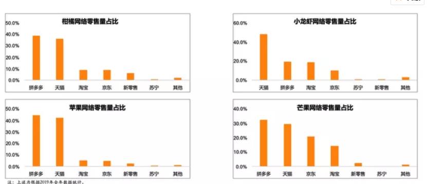 同時(shí),在蘋果、柑橘、芒果品類的網(wǎng)絡(luò)零售量分布中,來自拼多多等新電商平臺(tái)的渠道占比分別達(dá)44.35%、38.6%、32.2%,均排名第一。在“網(wǎng)紅單品”小龍蝦品類中,傳統(tǒng)電商平臺(tái)仍占絕對優(yōu)勢,但新電商平臺(tái)消費(fèi)增長迅速,渠道占比已躍居第二。