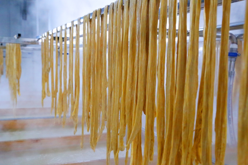 “大燉豆腐上桌嘍”??粗爸鵁釟獾孽r嫩白軟的燉豆腐和金黃色的涼拌腐竹、炒豆皮,垂涎欲滴,食欲大增。眼前的一切,怎么也不能和幾十年前那個(gè)設(shè)施簡陋的豆腐作坊聯(lián)系到一起。索倫牧場依托萬畝大豆原糧基地,引進(jìn)現(xiàn)代化生產(chǎn)線,硬是把東北人的家常豆腐做出了包括豆腐、腐竹、豆皮、豆干等在內(nèi)的“豆尚索倫”系列大品牌!