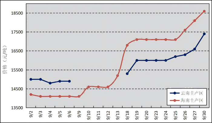 國內(nèi)主產(chǎn)區(qū):9月,海南、廣東部分產(chǎn)區(qū)受強臺風侵襲,云南產(chǎn)區(qū)持續(xù)降雨,原料供應緊張,帶動收購價格大幅走高。云南產(chǎn)區(qū)因降雨未統(tǒng)計部分日期原料價格。云南、海南鮮膠乳(折干膠)月均價格分別為15743元/噸、15805元/噸,環(huán)比上漲1898元/噸、1991元/噸。