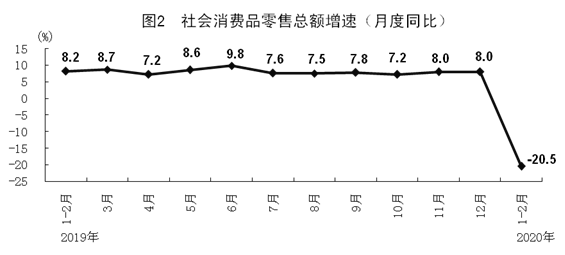 根據(jù)第四次全國經(jīng)濟(jì)普查結(jié)果對2019年社會消費(fèi)品零售總額進(jìn)行了修訂,2020年1-2月份增速按照可比口徑計算。