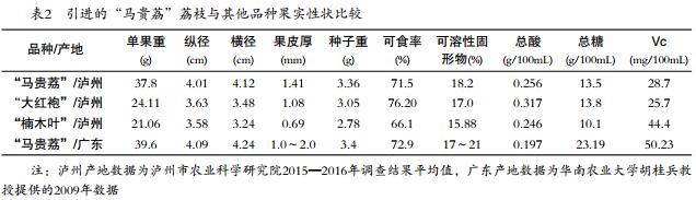 2013—2016年的調(diào)查數(shù)據(jù)顯示,引進(jìn)的“馬貴荔”荔枝與瀘州“大紅袍”荔枝嫁接親和性好,表現(xiàn)適應(yīng)瀘州地區(qū)氣候環(huán)境,高接換種后樹體生長好,易成花結(jié)果,較豐產(chǎn)。引進(jìn)的“馬貴荔”荔枝主要物候期均晚于瀘州地區(qū)主栽的“大紅袍”荔枝和晚熟的“楠木葉”荔枝,果實(shí)成熟期較“大紅袍”荔枝晚30d左右,較“楠木葉”荔枝晚7d左右。引進(jìn)的“馬貴荔”荔枝銷售時(shí)間錯(cuò)開了瀘州荔枝上市高峰期,延長了瀘州荔枝上市時(shí)間,對(duì)擴(kuò)大瀘州地區(qū)荔枝晚熟優(yōu)勢有所幫助。引進(jìn)的“馬貴荔”荔枝銷售價(jià)格連續(xù)3年高于當(dāng)?shù)刂髟缘摹按蠹t袍”荔枝和晚熟的“楠木葉”荔枝,商品價(jià)值較高。與原產(chǎn)地相比,引進(jìn)的“馬貴荔”荔枝在主要果實(shí)性狀和品質(zhì)上基本保持了原有的優(yōu)良特性,并優(yōu)于瀘州地區(qū)主栽的“大紅袍”荔枝和晚熟的“楠木葉”荔枝。但與“帶綠”“紅繡球”等優(yōu)質(zhì)晚熟荔枝相比,“馬貴荔”荔枝在品質(zhì)上還存在某些方面的不足,如核大、成熟后味道容易變淡等。從綜合性狀看,“馬貴荔”荔枝適合在瀘州荔枝優(yōu)勢發(fā)展區(qū)進(jìn)行適量推廣應(yīng)用,其特遲熟等特性將為瀘州地區(qū)荔枝雜交育種提供一份難得的種質(zhì)資源。
