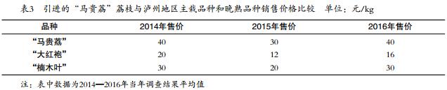 2014—2016年,引進(jìn)的“馬貴荔”荔枝平均銷售價(jià)格分別為40元/kg、30元/kg和40元/kg。與瀘州地區(qū)主栽品種和晚熟品種相比,2014年引進(jìn)的“馬貴荔”荔枝平均銷售價(jià)格為“大紅袍”荔枝的2.0倍、“楠木葉”荔枝的1.3倍;2015年引進(jìn)的“馬貴荔”荔枝平均銷售價(jià)格為“大紅袍”荔枝的2.5倍、“楠木葉”荔枝的1.5倍;2016年引進(jìn)的“馬貴荔”荔枝平均銷售價(jià)格為“大紅袍”荔枝的2.5倍、“楠木葉”荔枝的1.3倍??梢姟榜R貴荔”荔枝引進(jìn)瀘州后,連續(xù)3年銷售價(jià)格高于當(dāng)?shù)刂髟缘摹按蠹t袍”荔枝和當(dāng)?shù)赝硎斓摹伴救~”荔枝。