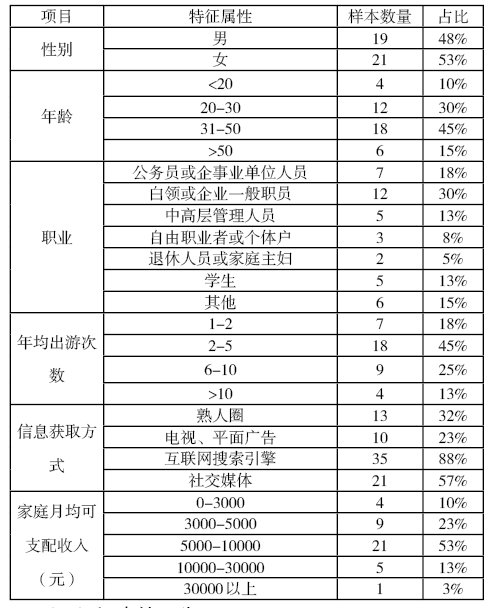 通過深度訪談形成基本的測(cè)試樣本,受訪者中,企事業(yè)單位職工和白領(lǐng)占48%;年均出游次數(shù)以2-5次居多,占45%;習(xí)慣利用互聯(lián)網(wǎng)搜索、社交媒體獲取信息?;緦傩砸娤卤?。